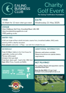 We’re delighted to invite you to Ealing Business Club’s Charity Golf Day 2025, a fantastic day of golf, good company, and giving back — all in support of the Ealing Trailfinders Foundation.